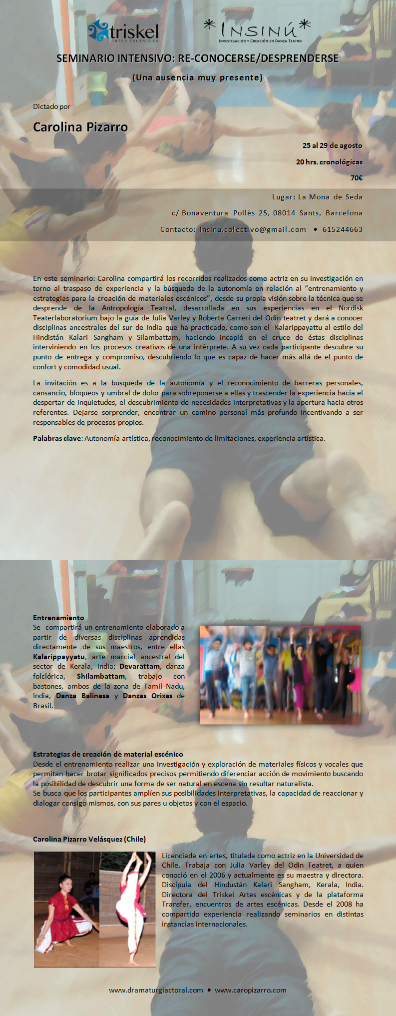 Desde el 25 al 29 de agosto de 2014, de 10 a 14 hrs.,nuestra amiga la actriz Carolina Pizarro dictará un seminario intensivo de teatro en Barcelona, dirigido a estudiantes y artistas que hayan comenzado una investigación en el área corporal. Si estás interesado puedes contactarnos para conocer más detalles y reservar tu inscripción.