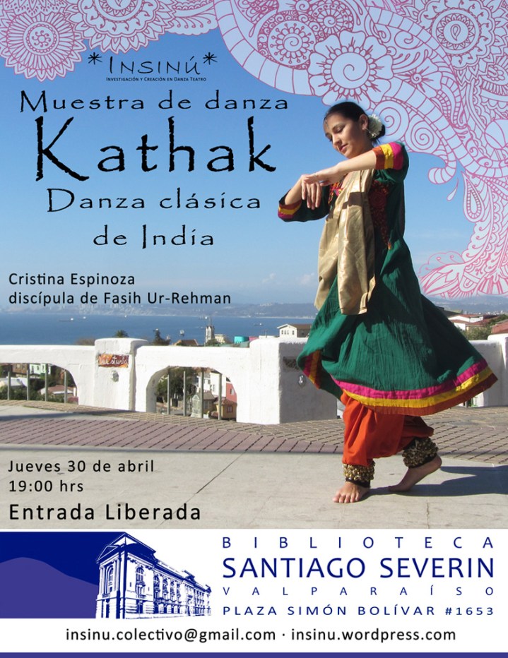 Ya de regreso del II Taller de kathak en Concepción, el próximo jueves 30 de abril realizaremos una muestra de danza kathak en la Biblioteca Severin de Valparaíso. El evento, enmarcado dentro de las actividades del Día Internacional de la Danza, incluirá una pequeña charla acerca de esta danza clásica de India, de su maestro Fasih Ur Rehman y de la escuela Lahore Lucknow Gharana.
